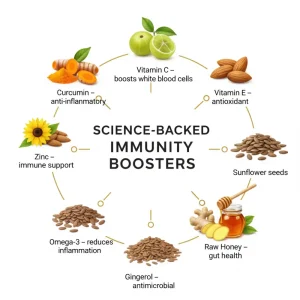 Immunity-boosting snacks combine key nutrients that work together to strengthen your body’s defenses. Ingredients like turmeric, amla, almonds, flaxseeds, sunflower seeds, ginger, and honey provide: